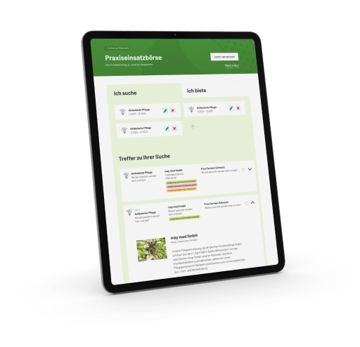 Gleichzeitig können sich dort Pflegeschulen und Ausbildungsverbünde präsentieren, um von neu einsteigenden Praxiseinrichtungen gefunden zu werden.